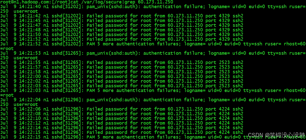 查看/var/log/secure文件寻找可疑IP登陆次数