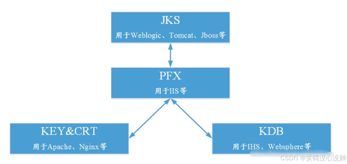 Tomcat、Weblogic、JBoss等,使用Java提供的密码库。通过Java的Keytool工具,生成Java Keystore(JKS)格式的证书文件。
