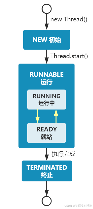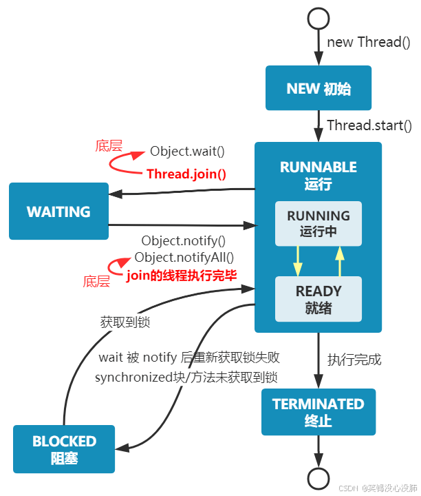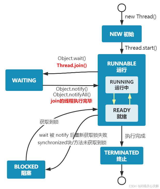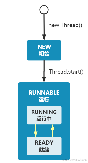 无论是 Java 语言,还是操作系统,都不区分这两种状态,在 Java 中统统叫 RUNNABLE。