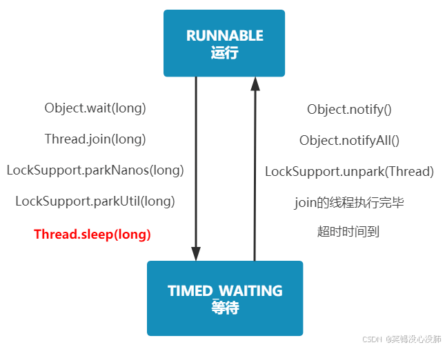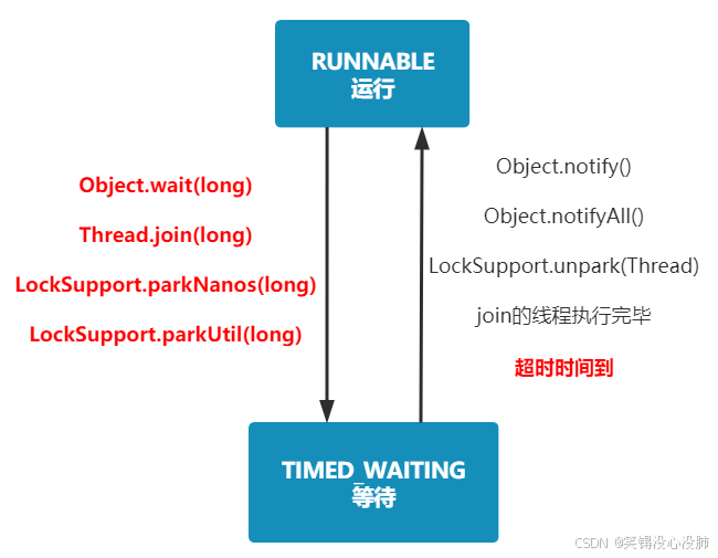 这些方法的唯一区别就是,从 TIMED_WAITING 返回 RUNNABLE,不但可以通过之前的方式,还可以通过到了超时时间,返回 RUNNABLE 状态。
