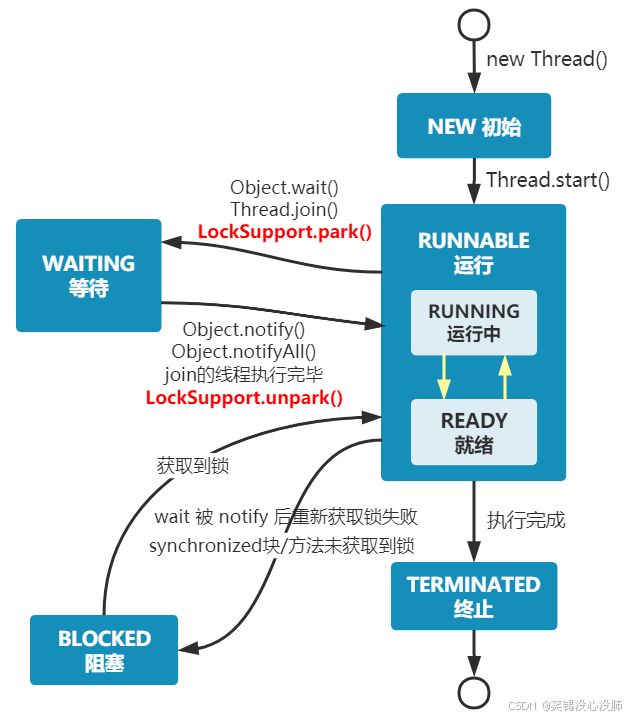 不过如果你仔细看我上面的文章,有一句话提到了,jdk 中锁的实现,是基于 AQS 的,而 AQS 的底层,是用 park 和 unpark 来挂起和唤醒线程,所以应该是变为 WAITING 或 TIMED_WAITING 状态。