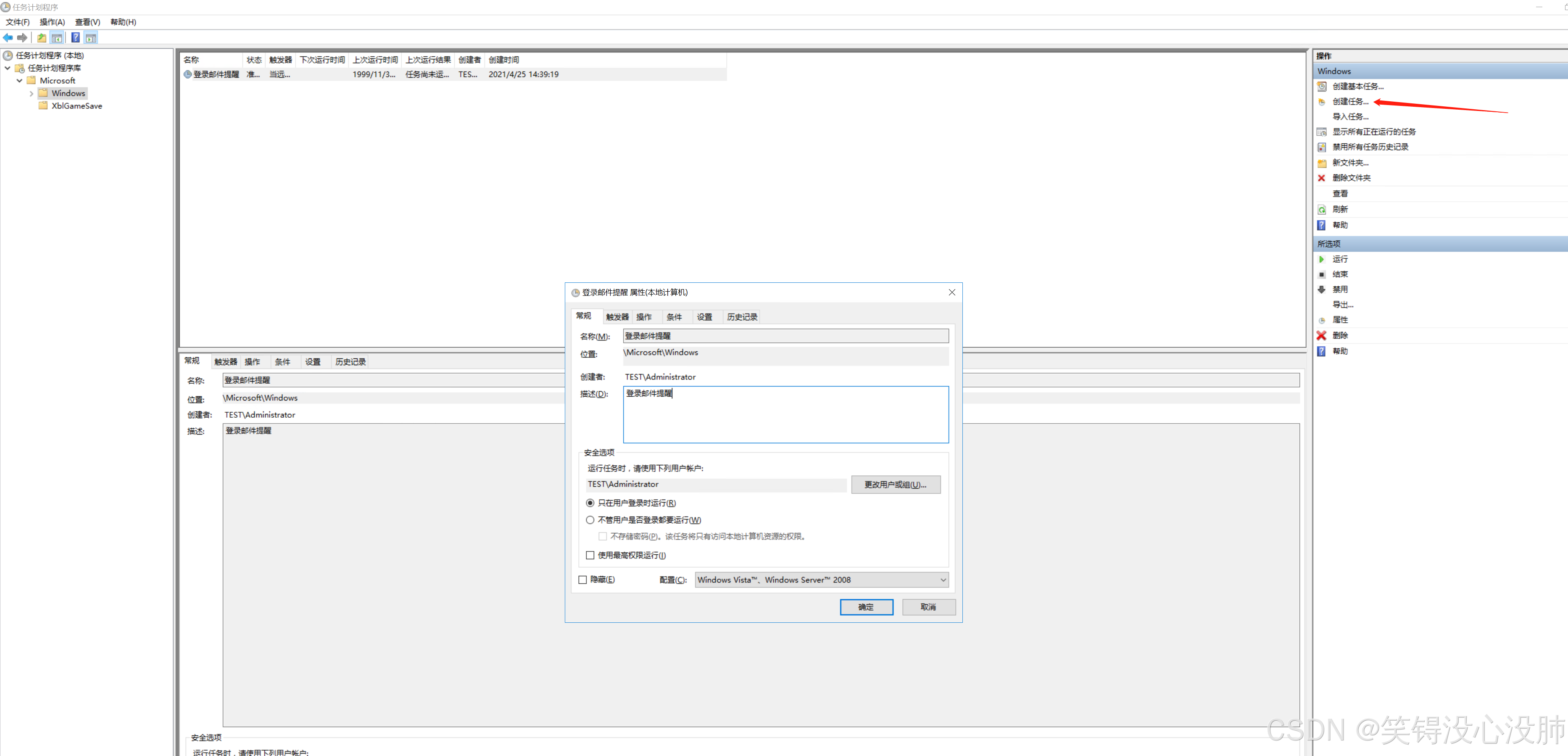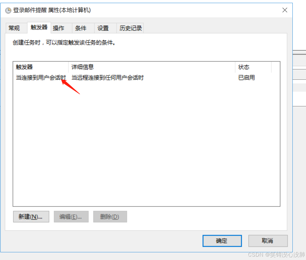 4..在管理工具中打开计划任务,新建计划任务,在触发器选项中新建“当连接到用户会话时”,在操作选项中新建操作。