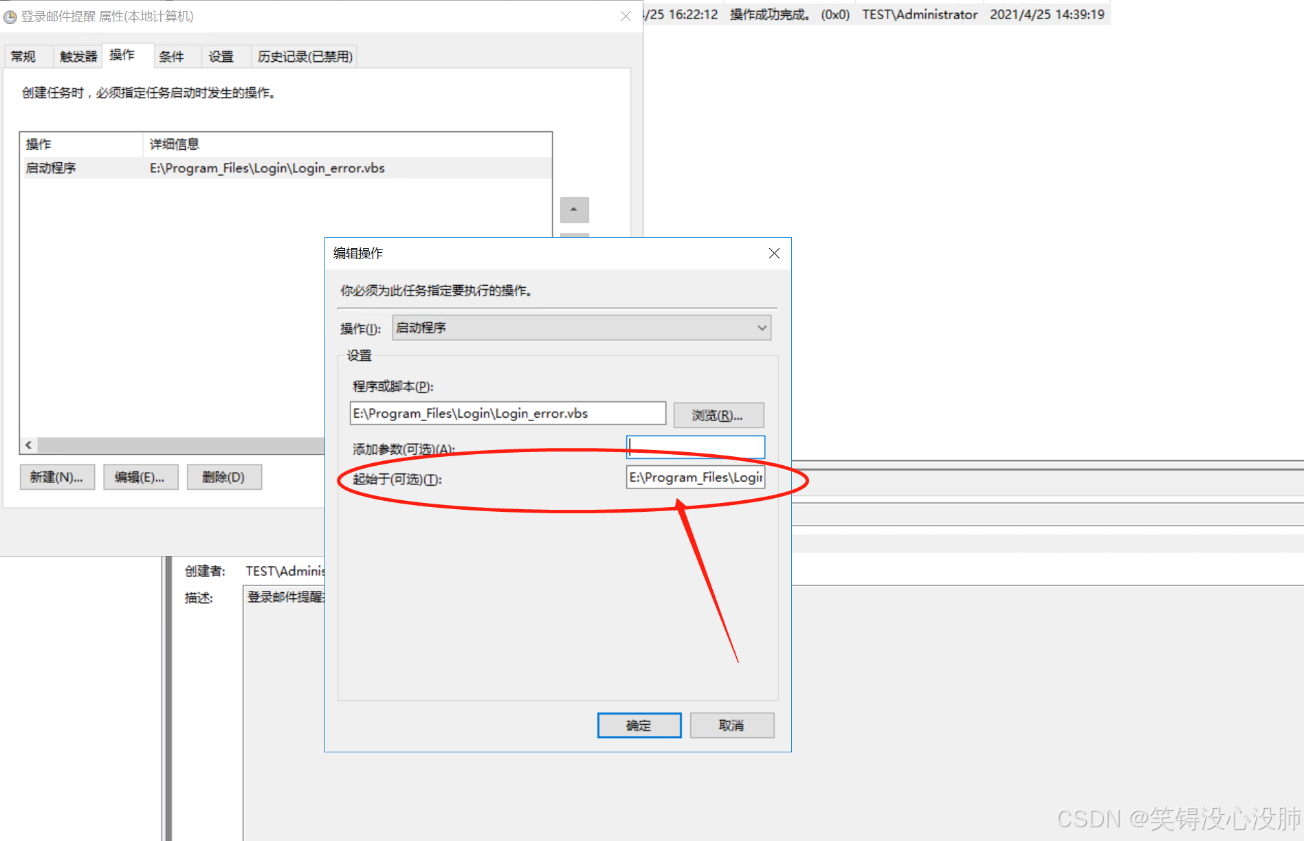 进入到编辑操作界面,“程序或脚本”填入要执行的脚本的路径,“起始于”处填入脚本所在的目录,点击“确定”