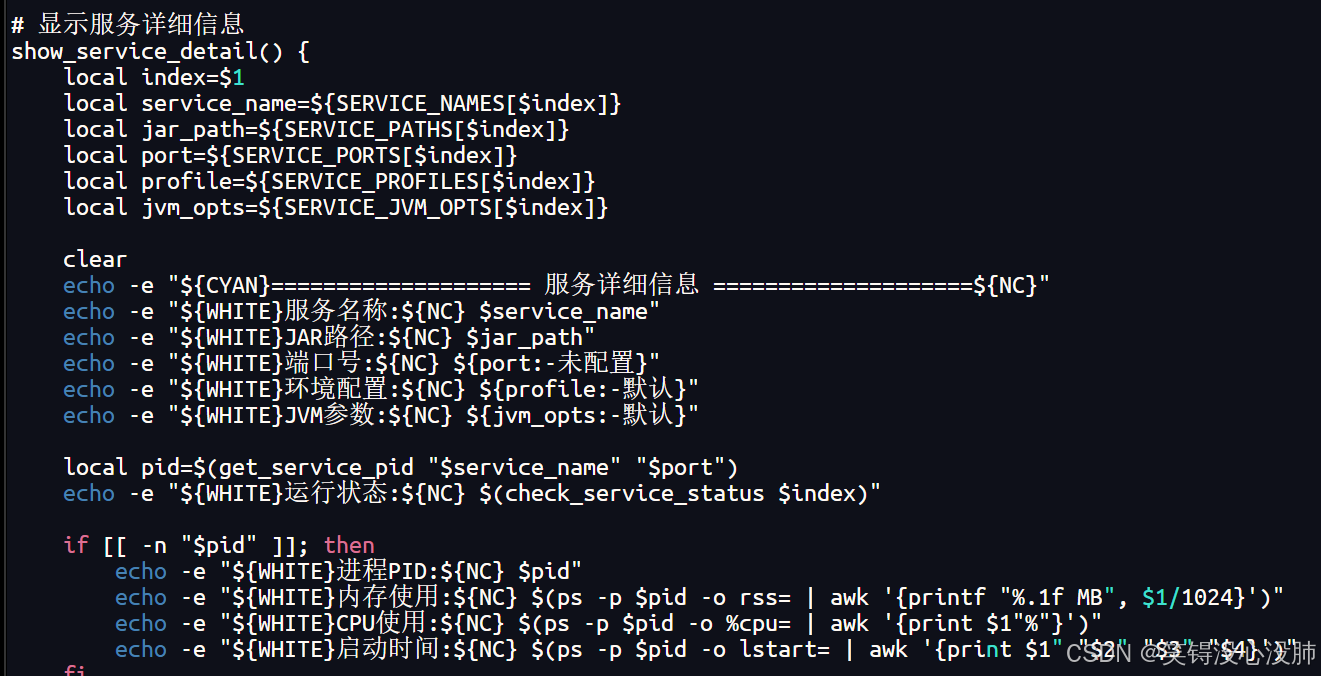 echo -e "${GREEN}#################### SpringBoot服务管理器 ####################${NC}"