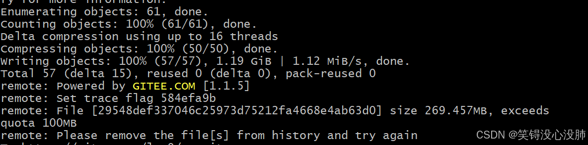即使你从本地删除了大文件,Git 仍然保留了该文件在历史记录中,所以 push 的时候还是会尝试上传整个历史(包括那个大文件),从而失败。