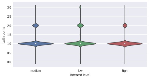 sns.violinplot(x='interest_level', y='bathrooms', data=train_df)