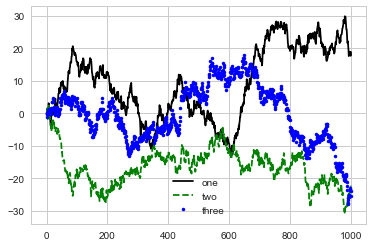 ax.plot(np.random.randn(1000).cumsum(), 'k', label='one') #这里不写label的话,后面图例就不会显示