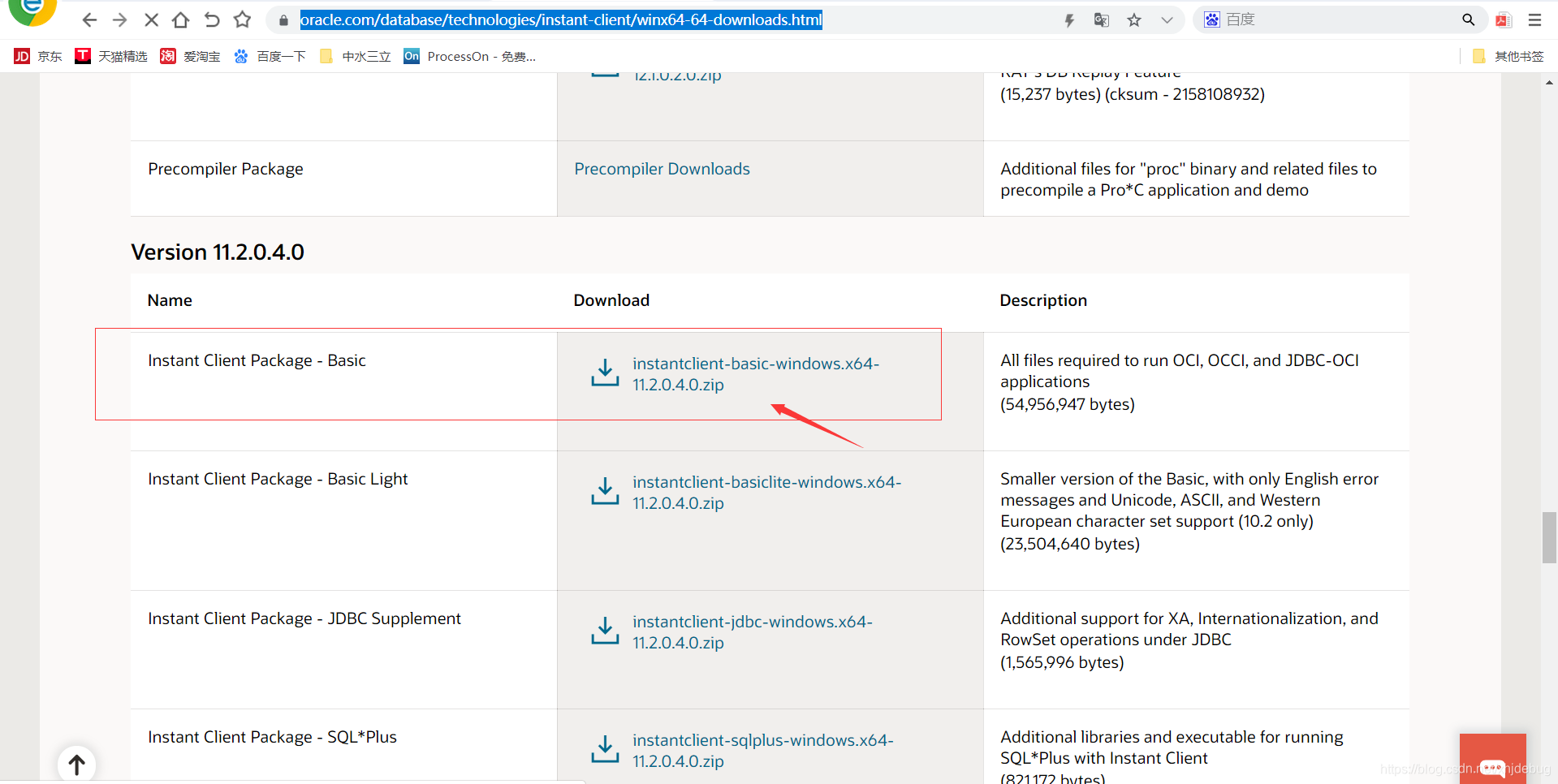 3、下载OracleClient时选择下载BASIC版本,下载时位数和版本号一定要一致!