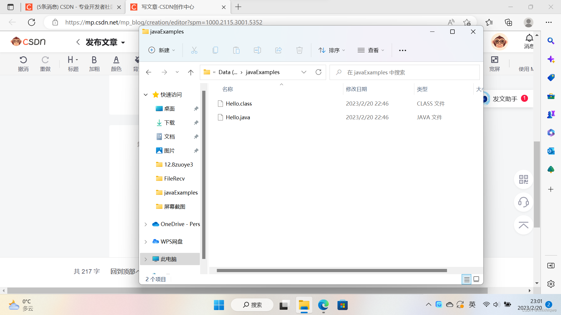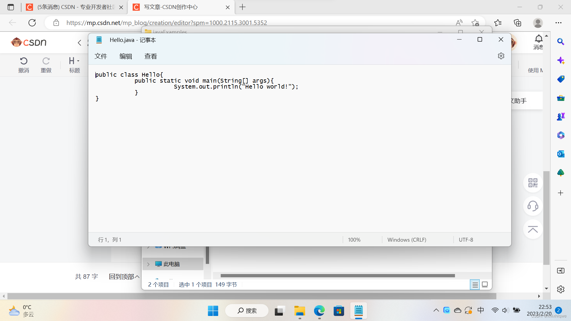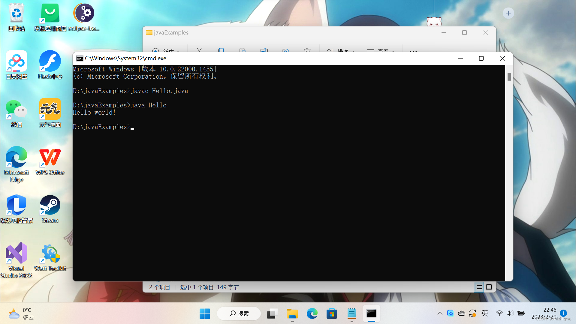 输入我想要编写的代码“hello world”并保存再于上方路径输入cmd唤出jdk11。