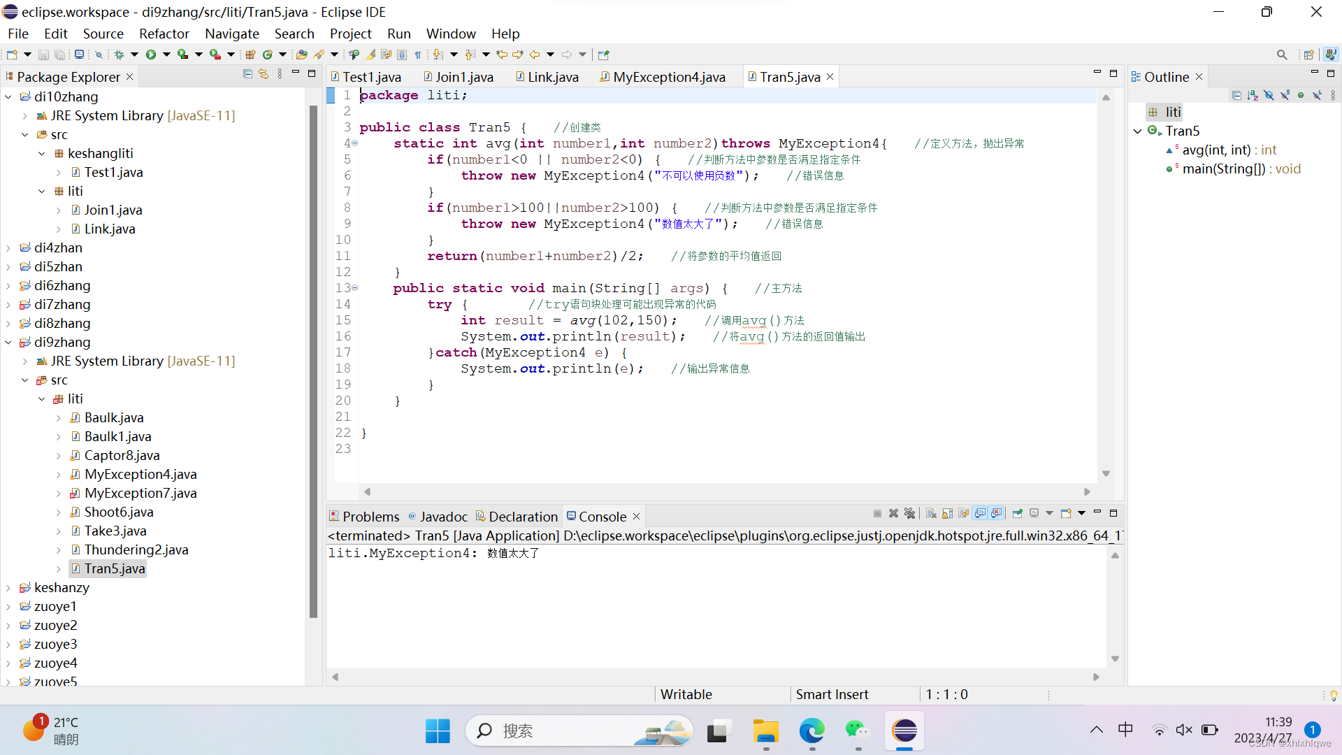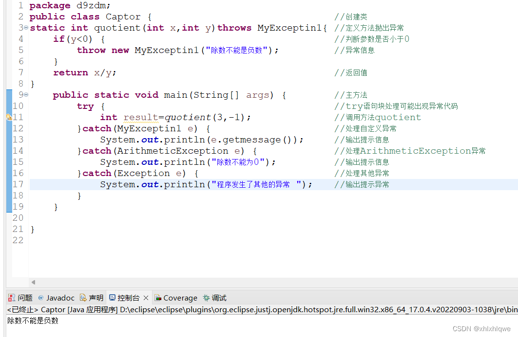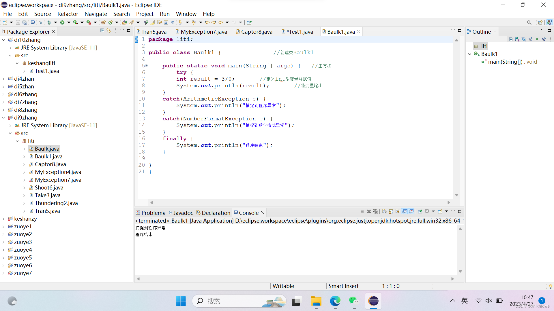 从上图可以看出,程序仍然输出最后的提示信息,没有因为异常而终止。Java的异常处理是结构化的,不会因为一个异常影响整个程序的运行。