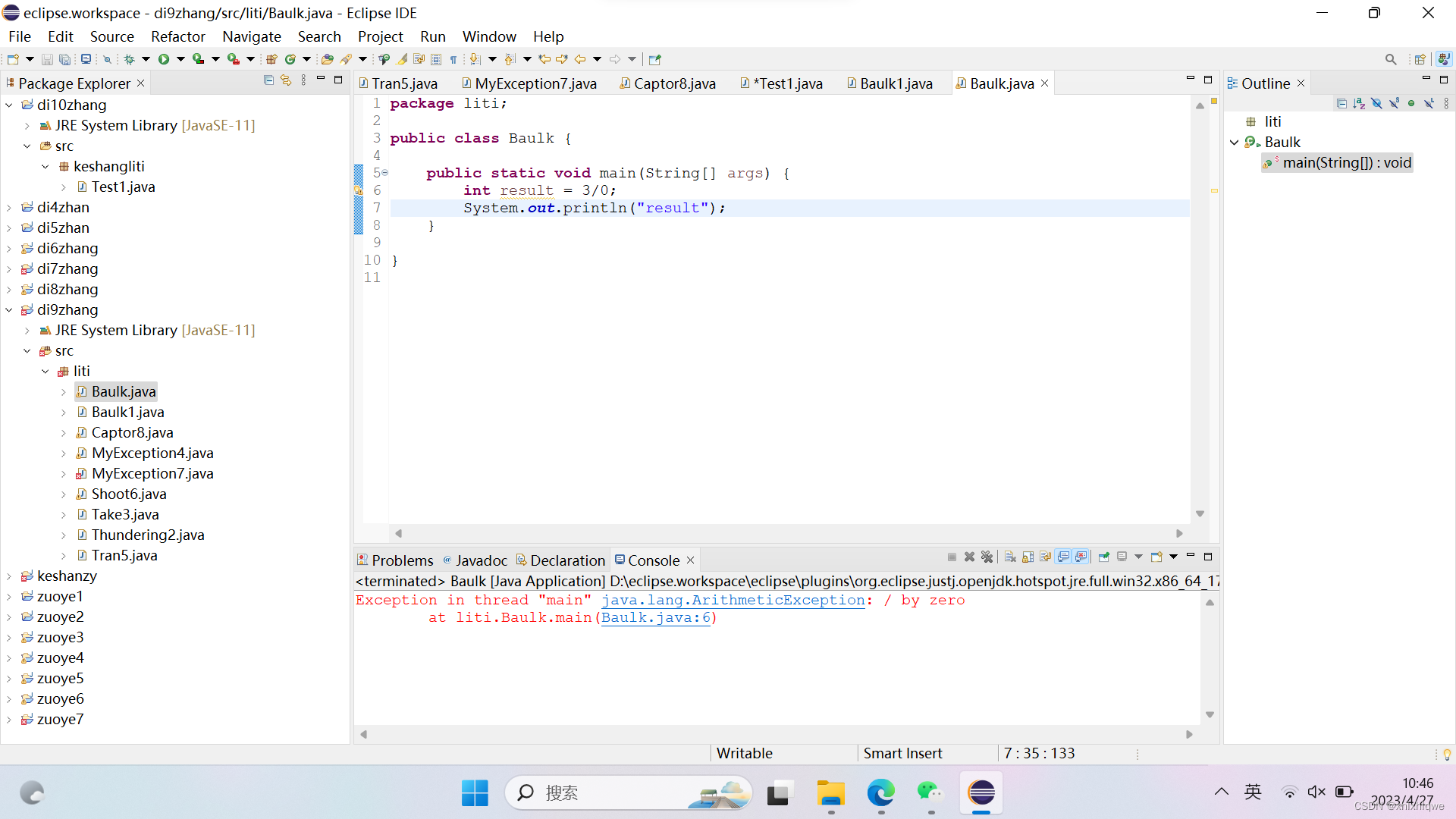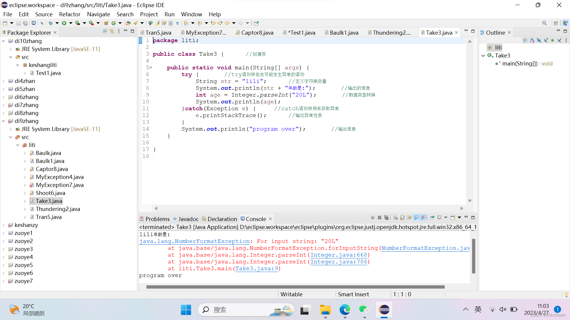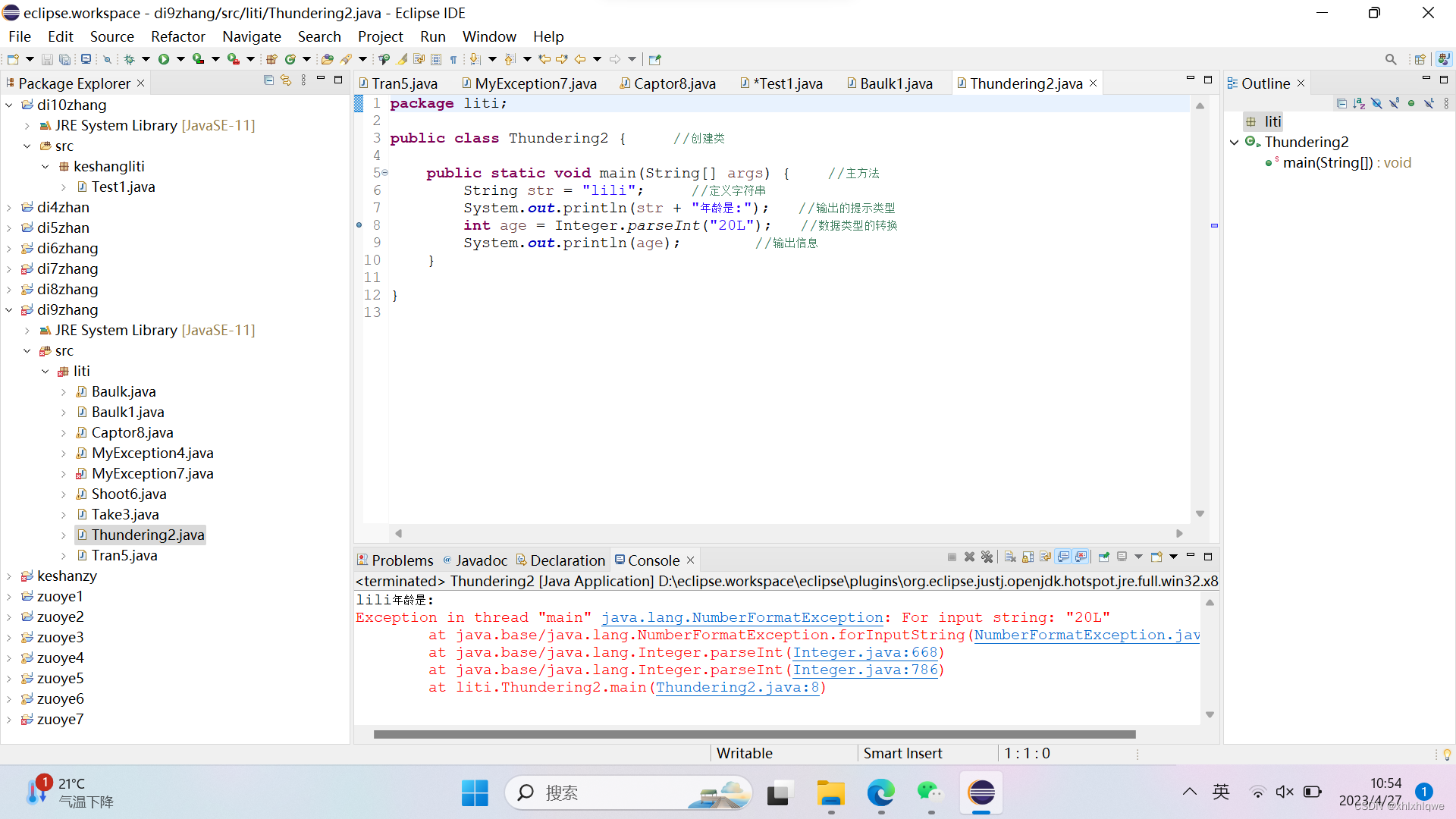 从上图可以看出,程序仍然输出最后的提示信息,没有因为异常而终止。Java的异常处理是结构化的,不会因为一个异常影响整个程序的运行。