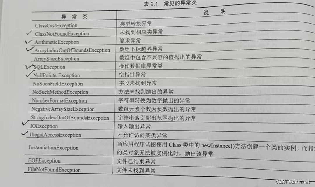 在Java中,提供了异常类用来描述经常发生的异常。其中,有的需要程序员进行捕获处理或声明抛出,有的是由Java虚拟机自动进行捕获处理。Java中常见的异常类如下表所示: