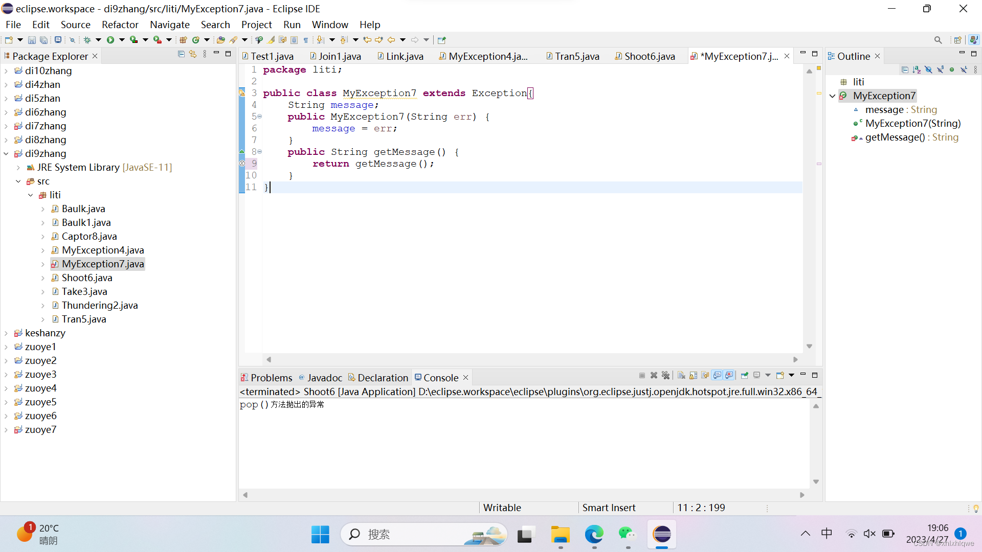 throw 关键字通常用于方法体中,并且抛出一个异常对象。程序在执行到 throw 语句时立即终止,它后面的语句都不执行。通过 throw 抛出异常后,如果想在上一级代码中捕获并处理异常,则需要在抛出异常的方法中使用 throws 关键字在方法的声明中指明要抛出的异常;如果要捕捉 throw 抛出的异常,则必须使用try_catch语句块。例题如下: