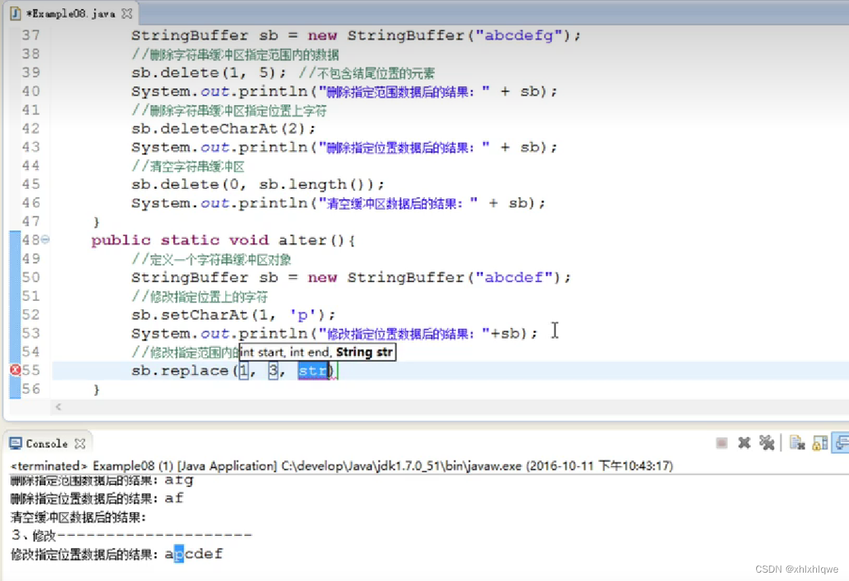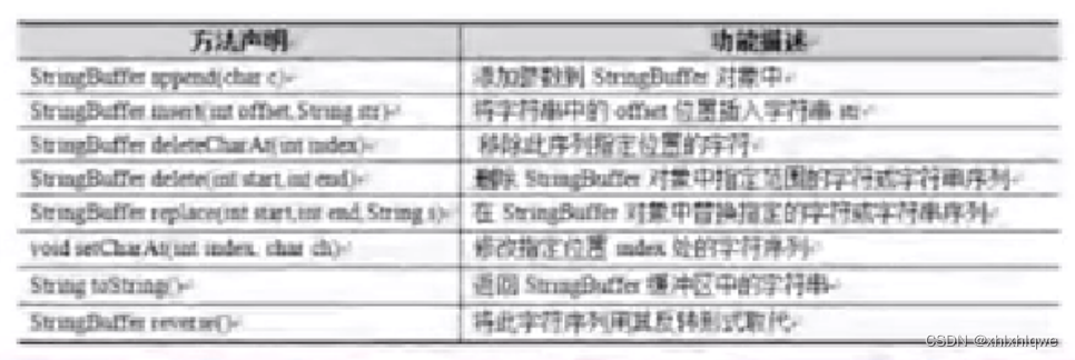 由于字符串是常量,因此一旦创建,其内容和长度是不可改变的。如果需要对一个字符串进行修改,则只能创建新的字符串。为了便于对字符串进行修改,在JDK中提供了一个StringBuffer类(也称字符串缓冲区)。StringBuffer类和String类最大的区别在于它的内容和长度都是可以改变的。StringBuffer类似一个字符容器,当在其中添加或删除字符时,并不会产生新的StringBuffer对象.针对添加和删除字符的操作,StringBuffer类提供了一系列的方法,具体如下表所示: