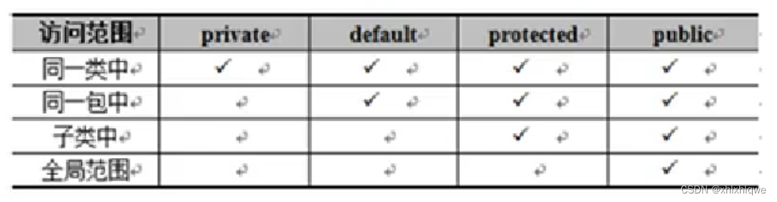 上图中展示了Java中的四种访问控制级别,具体介绍如下:private(类访问级别):如果类的成员被private访问控制符来修饰,则这个成员只能被该类的其他成员访问,其他类无法直接访问。类的良好封装就是通过private关键字来实现的。