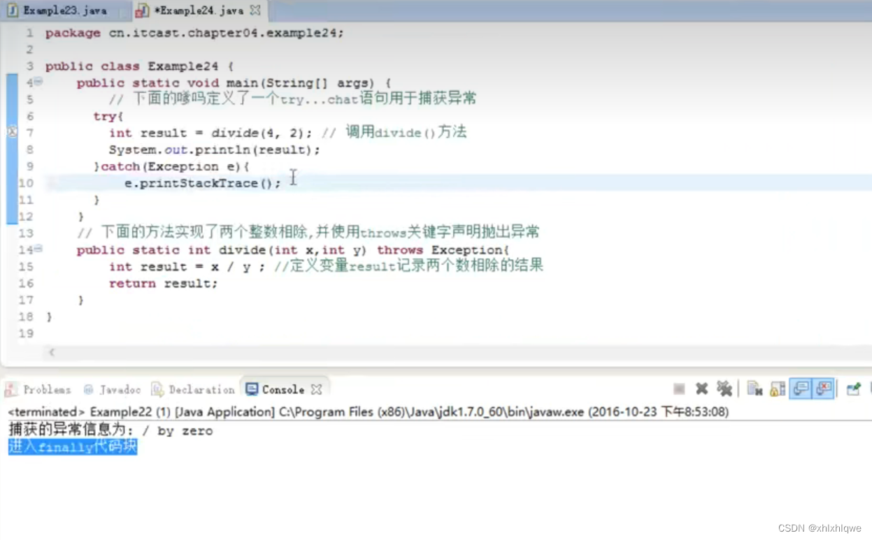 在上一小节学习的文件4-35Example22.java中,由于调用的是自己写的divide()方法,因此很清楚该方法可能会发生异常。试想一下,如果去调用一个别人写的方法时,是否能知道别人写的方法是否会有异常呢? 这是很难做出判断的针对这种情况,Java中允许在方法的后面使用throws关键字对外声明该方法有可能发生的异常,这样调用者在调用方法时,就明确地知道该方法有异常,并且必须在程序中对异常进行处理,否则编译无法通过。
