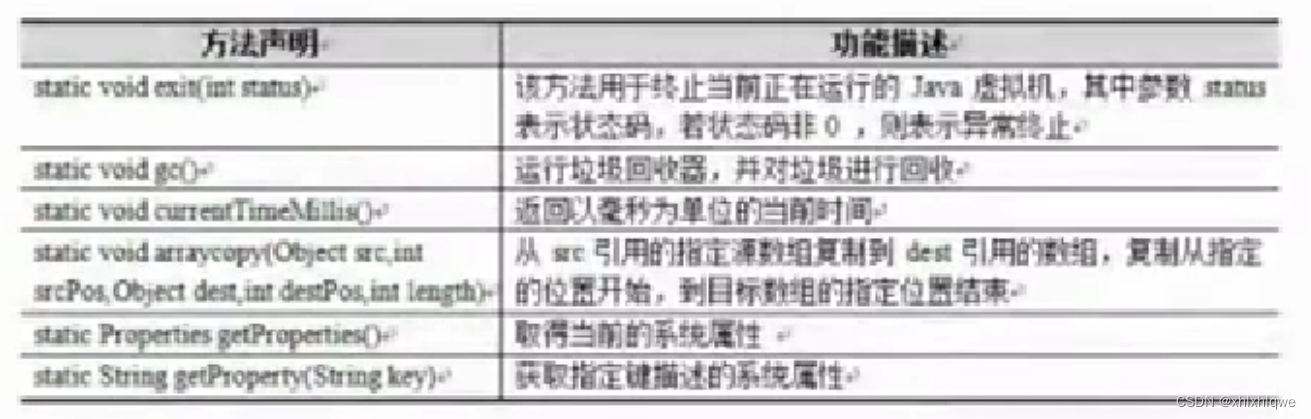 System类对读者来说并不陌生,因为在之前所学知识中,需要打印结果时,使用的都是“System.out.println();”语句,这句代码中就使用了System类。System类定义了一些与系统相关的属性和方法,它所提供的属性和方法都是静态的因此,想要引用这些属性和方法,直接使用System类调用即可。Svstem类的常用方法如下表所示: