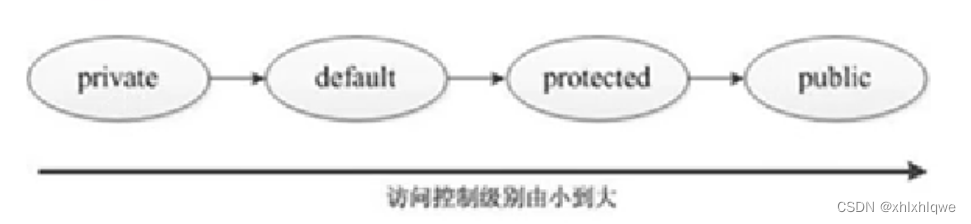 在Java中,针对类、成员方法和属性提供了四种访问级别,分别是private、default、protected和public。接下来通过一个图将这四种控制级别由小到大依次列出,如下图所示: