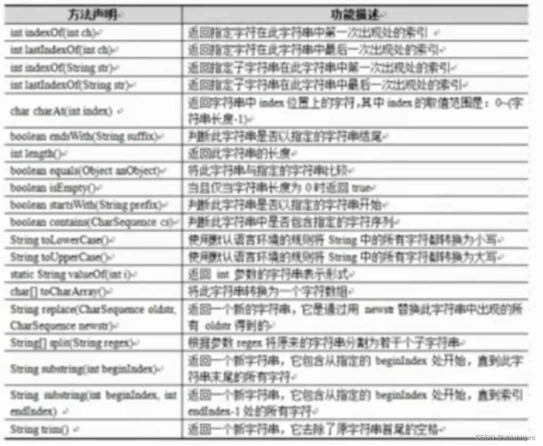 String类在实际开发中的应用非常广泛,因此灵活地使用string类是非常重要的,接下来介绍String类常用的一些方法如下表所示: