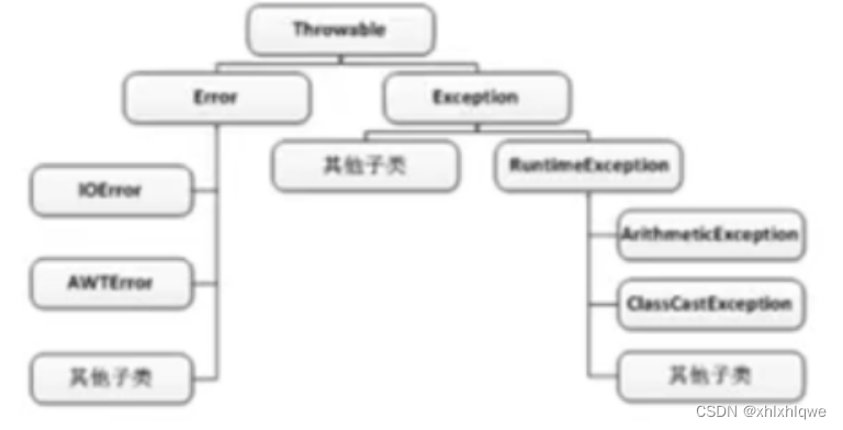 通过图中可以看出,Throwable有两个直接子类Error和Exception,其中Error代表程序中产生的错误,Exception代表程序中产生的异常。