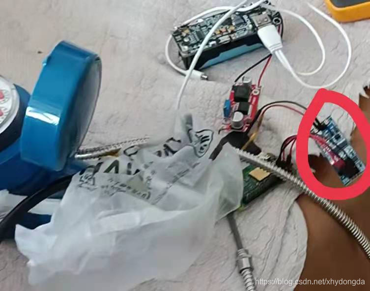 买一块TTL-485转换板,带隔离的贵些。下图中,红圈中的就是带隔离的TTL-485转换板,红板是5V可调升压板。