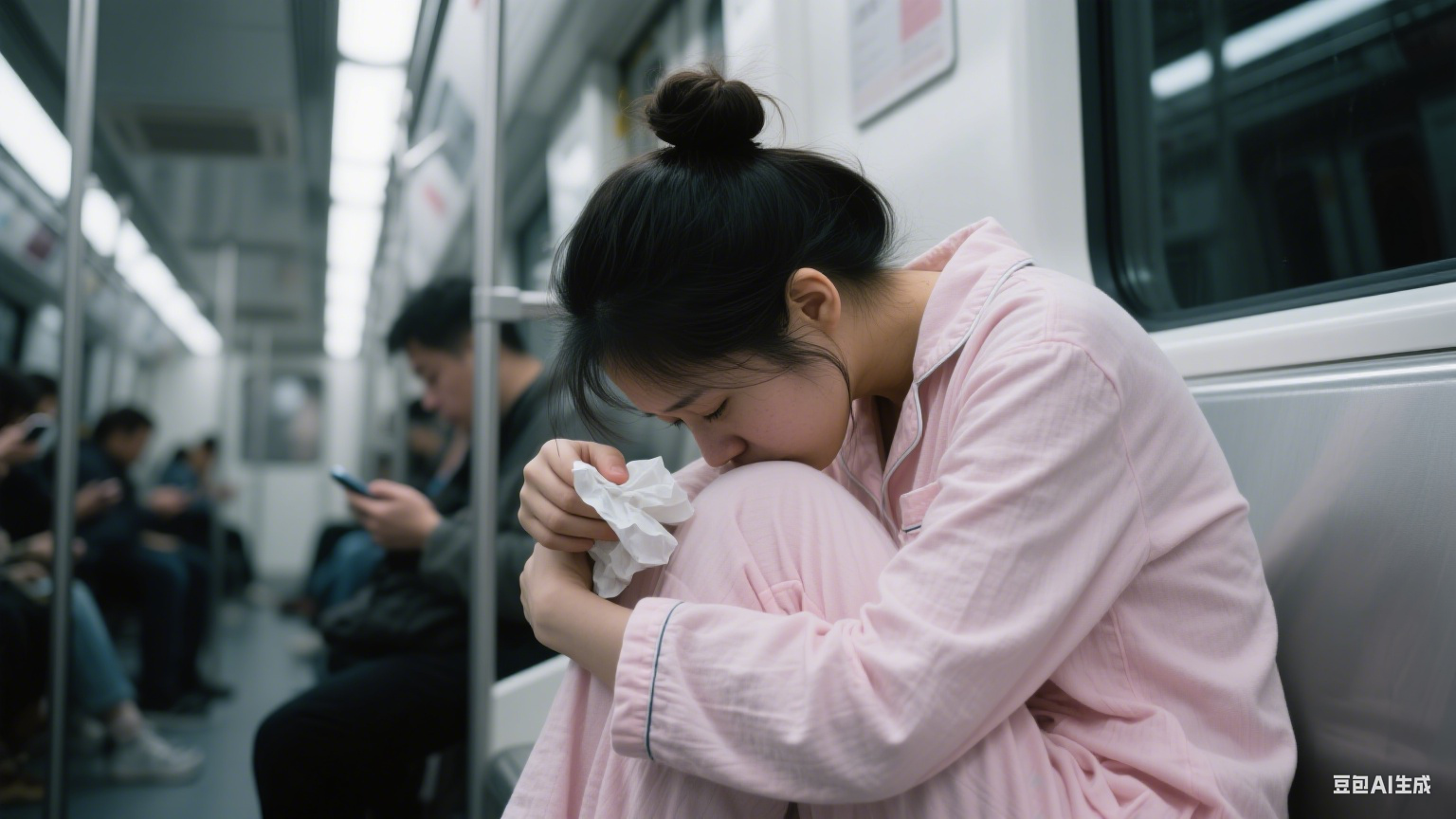 4. 地铁车厢:穿睡衣的姑娘,在人群里哭自己 “没用”