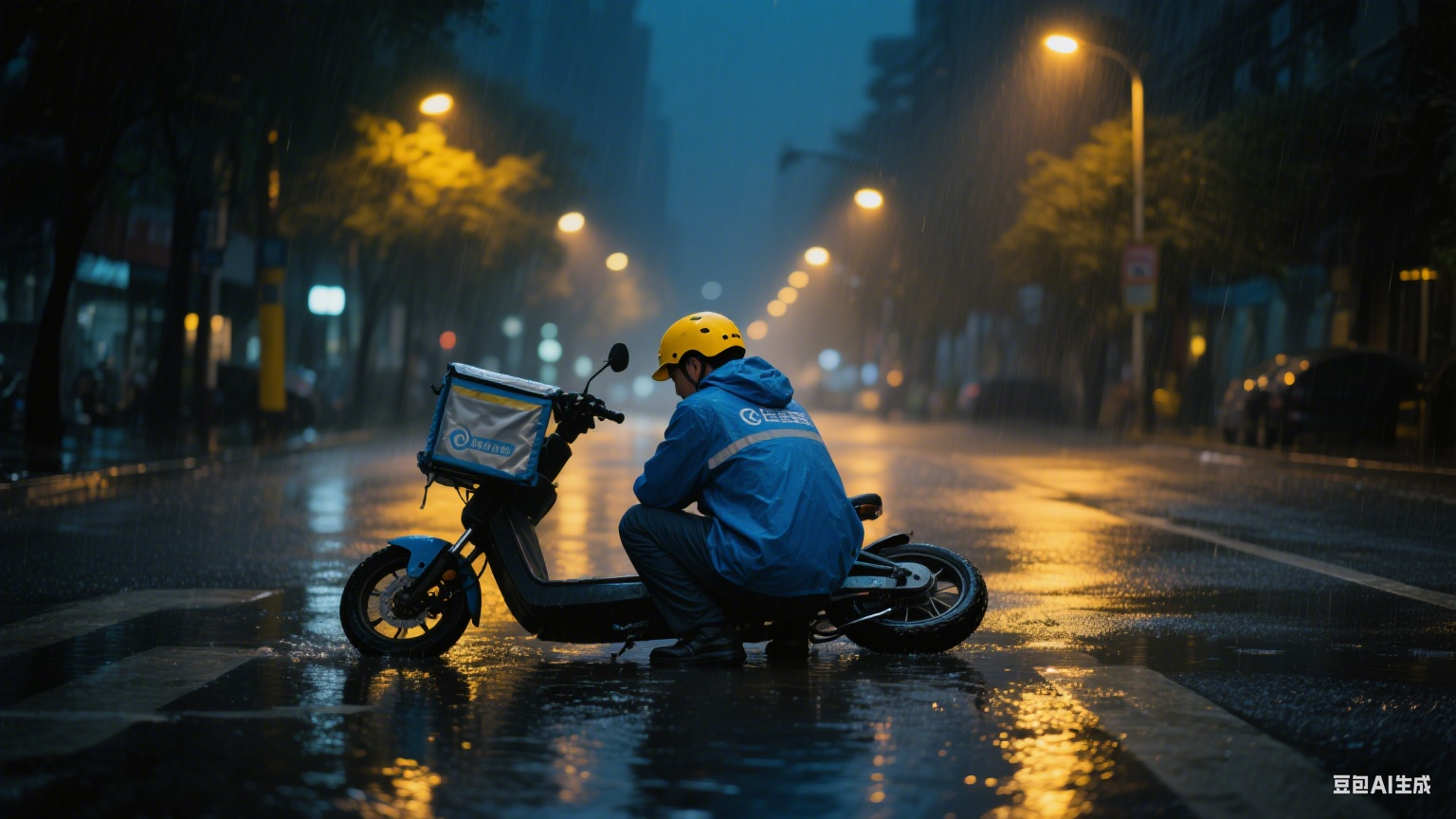 一个穿蓝色雨衣的外卖员,连人带车摔在路口,雨衣的帽子掉了,头发贴在脸上,雨水顺着下巴滴在手套上。