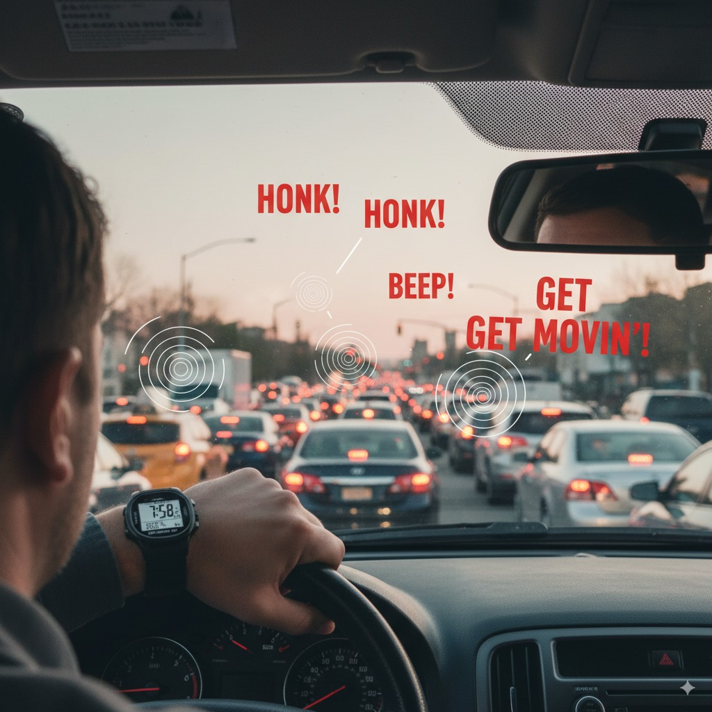 交通堵塞:早高峰堵在路口,看着手表上的打卡时间一点点靠近,喇叭声此起彼伏,心态先崩了;