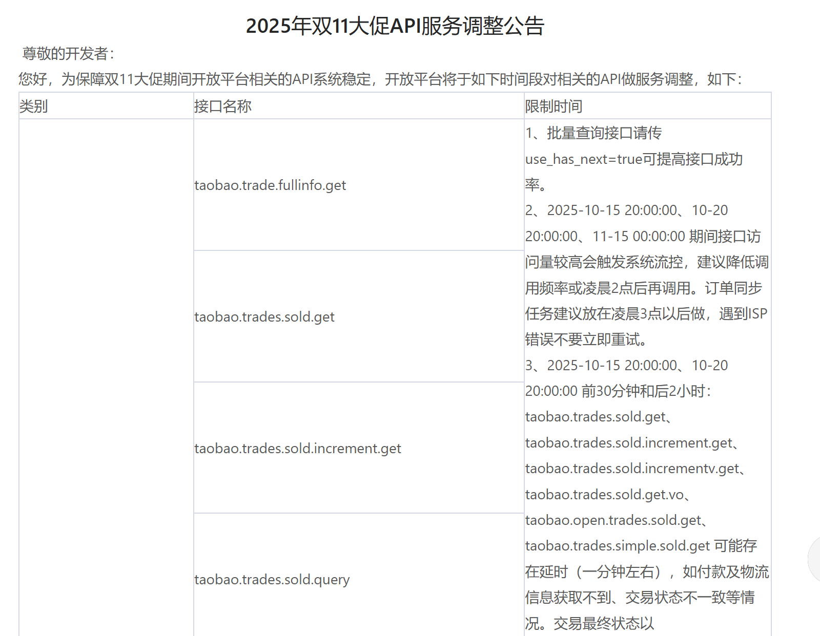 1.避开如店铺订单插旗、同步订单、物流发货等API接口的调用高峰期时段;