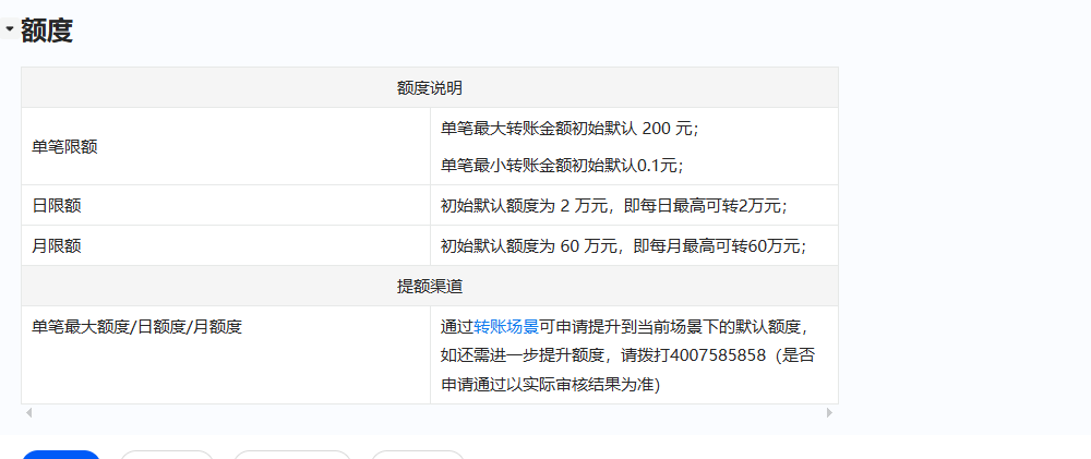 可以看到,日限额最大才只有2万,单笔转账最大金额只有200。