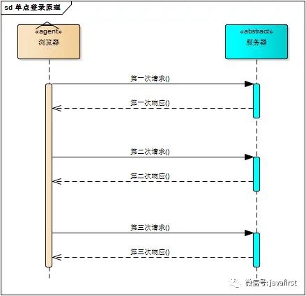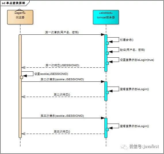 浏览器第一次请求服务器,服务器创建一个会话,并将会话的id作为响应的一部分发送给浏览器,浏览器存储会话id,并在后续第二次和第三次请求中带上会话id,服务器取得请求中的会话id就知道是不是同一个用户了,这个过程用下图说明,后续请求与第一次请求产生了关联。