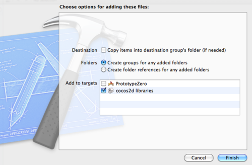 确保选择“ cocos2d libraries" ,并且把你的工程的target不要选中。同时,你要取消 "Copy items into destination group's folder (if needed)",因为有时候xcode4会出现一些bug。