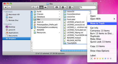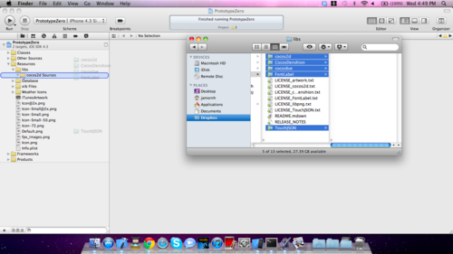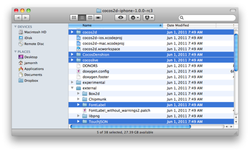 2.找到新下载的cocos2d文件夹,然后选择 cocos2d, CocosDenshion, cocoslive, FontLabel, and TouchJSON,并复制出来。如果你使用了box2d或者chipmunk的话,那么就多复制一个相应的box2d或者chipmunk文件夹。然后 把这些复制的文件夹粘贴到旧的工程的lib文件夹下面。(就是你刚刚删除一堆文件的那个文件夹下面)
