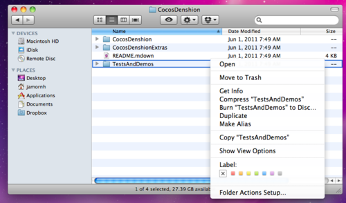 3. 打开CocosDenshion文件夹,然后删除 TestsAndDemos。因为这里面的东西,等下编译的时候会报错,所以我们要把它删除。(如果上一步中,大家拷贝了box2d的话,注意不是和 FontLabel平级目录的box2d,而是box2d里面的box2d。打开看看就知道了:),里面还有testbed的代码,那个不要。)