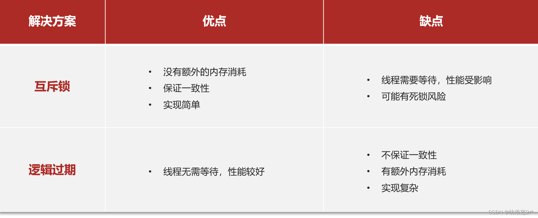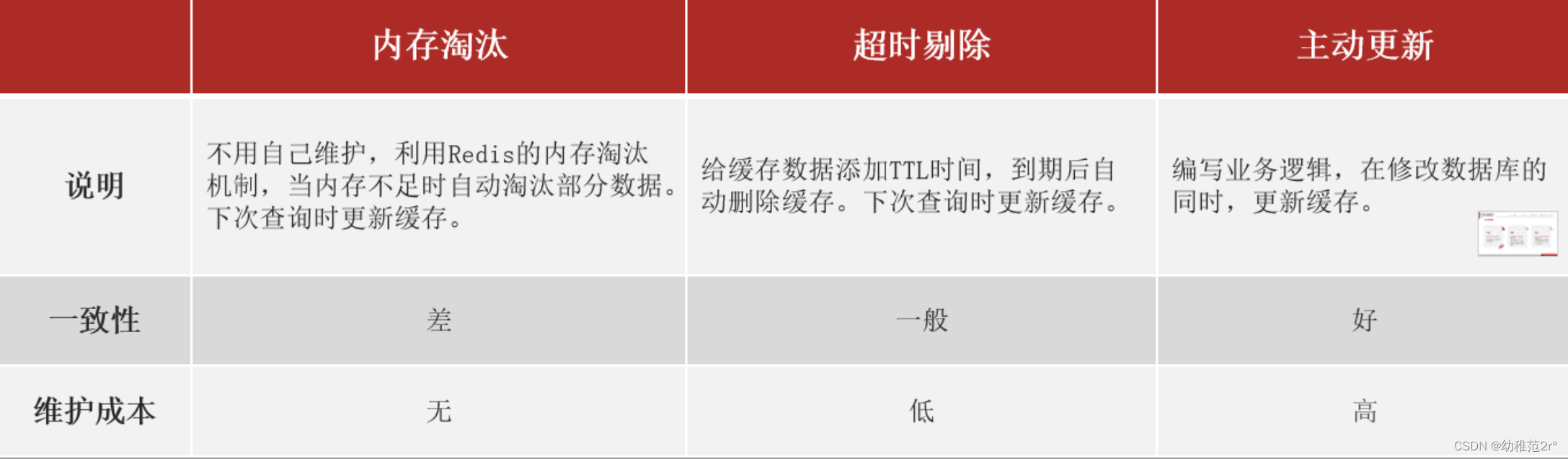 - 高一致性需求:主动更新,并以超时剔除作为兜底方案。例如店铺详情查询的缓存