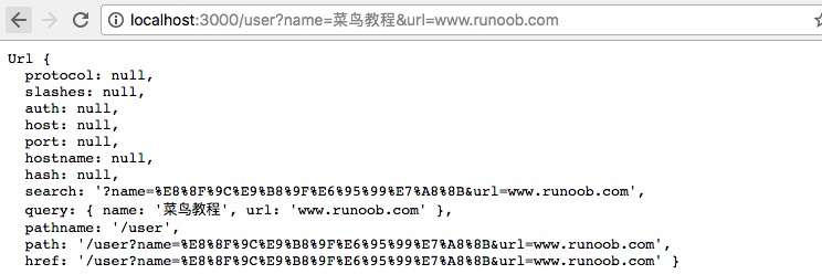在浏览器中访问 http://localhost:3000/user?name=菜鸟教程&url=www.runoob.com 然后查看返回结果: