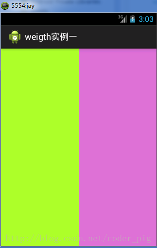 要实现第一个的1:1的效果,只需要分别把两个LinearLayout的weight改成1和1就可以了 用法归纳: 按比例划分水平方向:将涉及到的View的android:width属性设置为0dp,然后设置为android weight属性设置比例即可;类推,竖直方向,只需设android:height为0dp,然后设weight属性即可! 大家可以自己写个竖直方向的等比例划分的体验下简单用法!