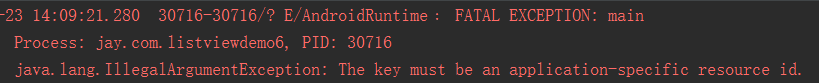 这里有个地方要注意的,convertView.setTag(R.id.Tag_APP,holder1);我们平时都直接 setTag(Object)的,这个是setTag的重载方法,参数是一个唯一的key以及后面的一个对象! 唯一!!我一开始直接把TYPE_BOOK作为第一个参数,然后就报下面这个错误: