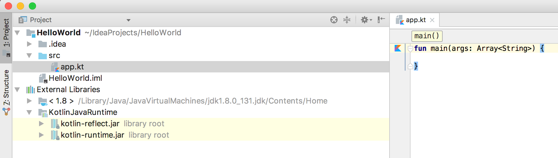 接下来,我们在 app.kt 文件中写点代码。IntelliJ IDEA 为我们提供了一个快速完成此操作的模板,只需键入 main 然后按 Tab 即可。