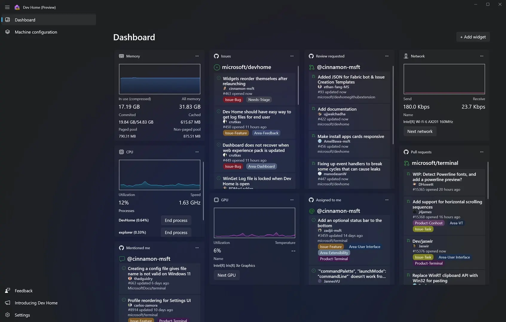 Dev Home 界面是一个可定制的仪表板,内含多种面向开发者的小部件,使您能够随时获得所需的信息。