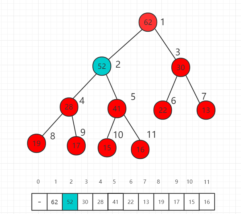 此时 52 依然比父节点索引为 2 的数值 41 大,我们还需要进一步挪位置。