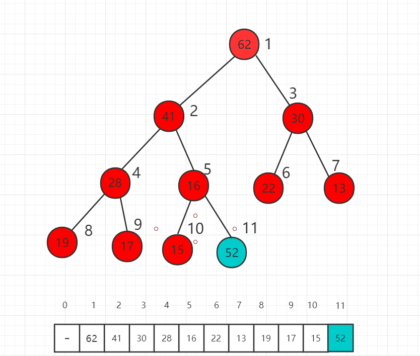 这时比较 52 和 62 的大小,52 已经比父节点小了,不需要再上升了,满足最大堆的定义。我们称这个过程为最大堆的 shift up。