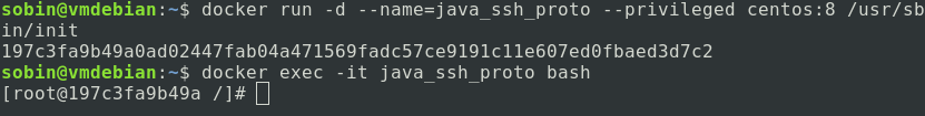 docker run -d --name=java_ssh_proto --privileged centos:8 /usr/sbin/init
