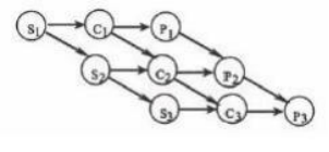 ●某计算机系统中有一个 CPU、一台扫描仪和一台打印机。现有三个图像处理任务,每 个任务有三个程序段:扫描 Si,图像处理 Q 和打印Pi(i=l,2,3)。下图为三个任务各程序 段并发执行的前驱图,其中, (2)可并行执行, (3)的直接制约, (4)的间接制约。