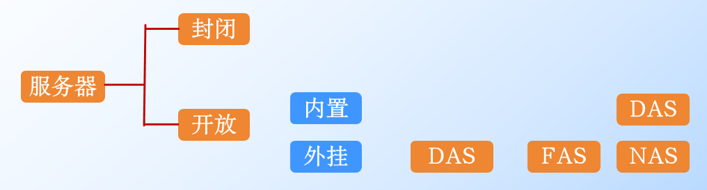 存储分类根据服务器类型分为:封闭系统的存储和开放系统的存储。封闭系统主要指大型机等服务器。开放系统指基于包括麒麟、欧拉、UNIX 、Linux等操作系统的服务器。开放系统的存储分为:内置存储和外挂存储。外挂存储根据连接的方式分为直连式存储(Direct-Attached Storage,DAS) 和网络化存储 (Fabric-Attached Storage,FAS)。网络化存储根据传输协议又 分为网络接入存储(Network-Attached Storage,NAS) 和存储区域网络 (Storage Area Network, SAN) 。