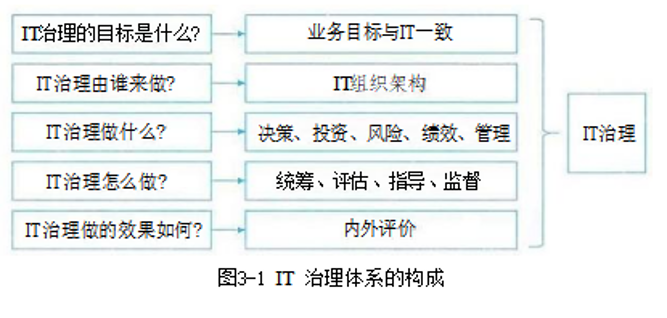 IT治理流程:统筹、评估、指导、监督; IT治理效果(内外评价)等。