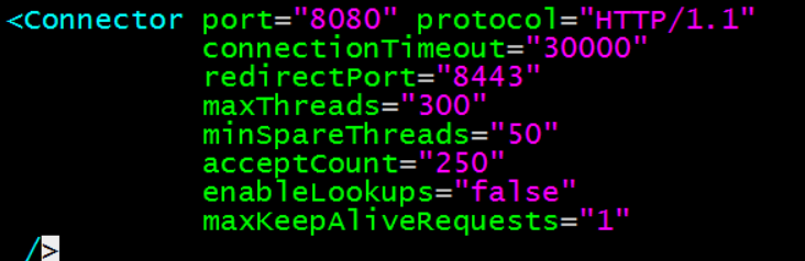 找到Tomcat根目录下的conf目录,修改server.xml文件的内容。对于这部分的调优,我所了解到的就是无非设置一下Tomcat服务器的最大并发数和Tomcat初始化时创建的线程数的设置,当然还有其他一些性能调优的设置,下图是根据我机子的性能设置的一些参数值