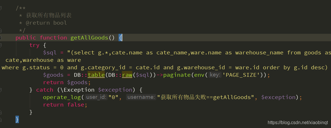 $goods = DB::table(DB::raw($sql))->paginate(env('PAGE_SIZE'));