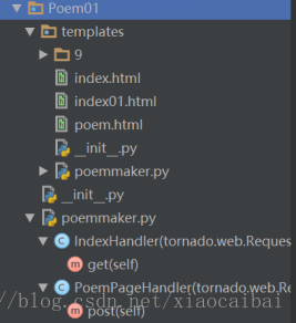 。我们可以清晰地看到在poemmaker.py文件下还有两个为:IndexHandler和PoemPageHandler的这是poemmaker.py文件的两个类,在这个两个类中分别的导入index01.html和poem.html两个Html文件。我们还可以看到在IndexHandler下有一个get方法,在PoemPageHandler下有一个post方法。