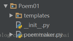 这是这个例子的文件级别。可以看到首先是poemmaker.py文件和templates文件在同一个文件级别下,相同级别的还有__init__.py文件(这个文件的作用在另一篇博客上简述)。